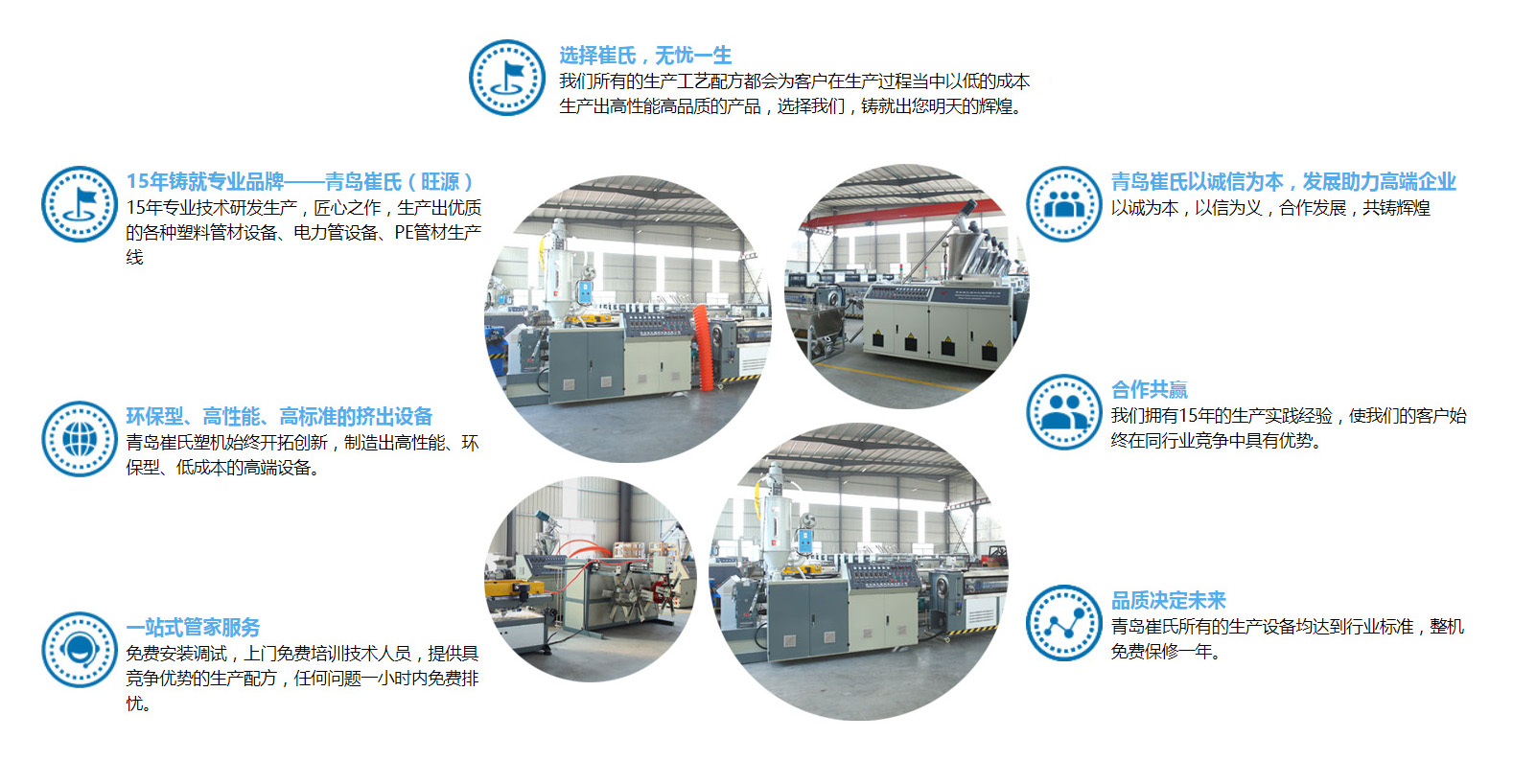 青島崔氏塑料機(jī)械:生產(chǎn)的預(yù)應(yīng)力塑料波紋管設(shè)備、電力管設(shè)備、塑料波紋管設(shè)備、汽車線束波紋管設(shè)備、PPR、PE、PVC、PERT管材設(shè)備及其它各種管材設(shè)備、塑料型材設(shè)備、塑料蜂窩板設(shè)備, 遠(yuǎn)銷:歐州,獨(dú)聯(lián)體,南美洲,中東,東南亞,大洋州,非洲等地的20多個(gè)國(guó)家和地區(qū)。
